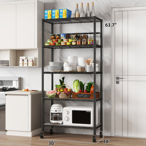 5-Shelf Shelving Units and Storage on 3'' Wheels with Shelf Liners Set of 5, NSF Certified, Adjustable Heavy Duty Carbon Steel Wire Shelving Unit (30W x 14D x 63.7H) Pole Diameter 1 Inch. item#: 33655