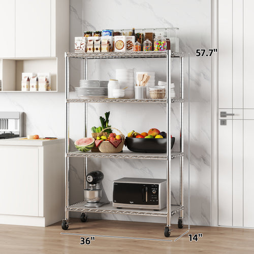 Chrome 4-Shelf Shelving Units and Storage on 3'' Wheels with 4-Shelf Liners, 36W X 14D X 57.7H Adjustable Heavy Duty Steel Wire Shelving Unit for Garage, Kitchen, Office Pole Diameter 1 Inch. item#: 33654